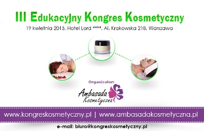 Serdecznie zapraszamy do wzięcia udziału w III edycji Edukacyjnego Kongresu Kosmetycznego, który odbędzie się 19 kwietnia 2015 (niedziela) w Hotelu Lord, w Warszawie.