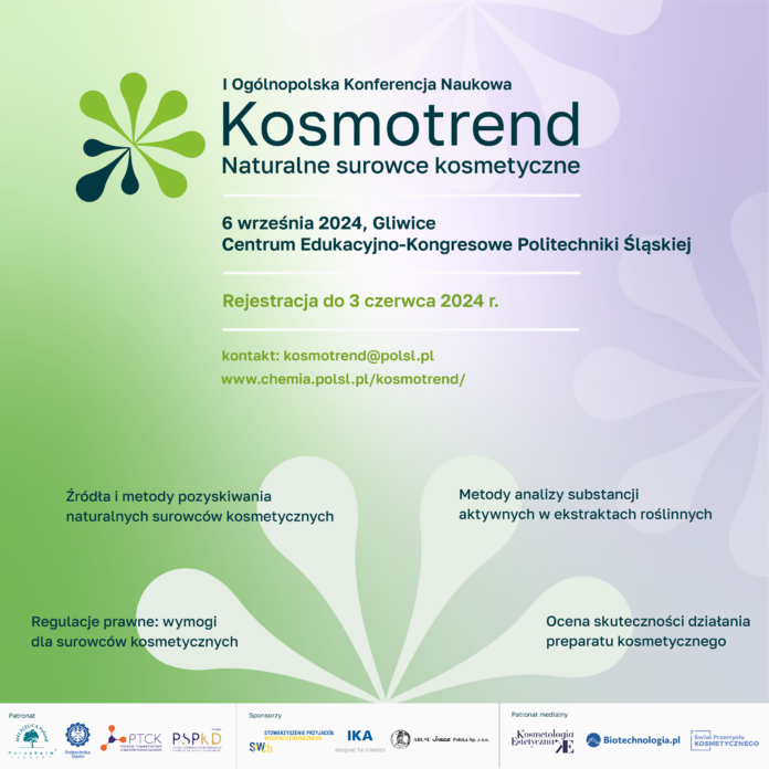 Zapraszamy przedstawicieli przemysłu kosmetycznego, środowiska naukowe oraz doktorantów i studentów do udziału w I Ogólnopolskiej Konferencji Naukowej „Kosmotrend – Naturalne surowce kosmetyczne”, która odbędzie się 6 września 2024r. w Centrum Edukacyjno-Kongresowym Politechniki Śląskiej w Gliwicach.