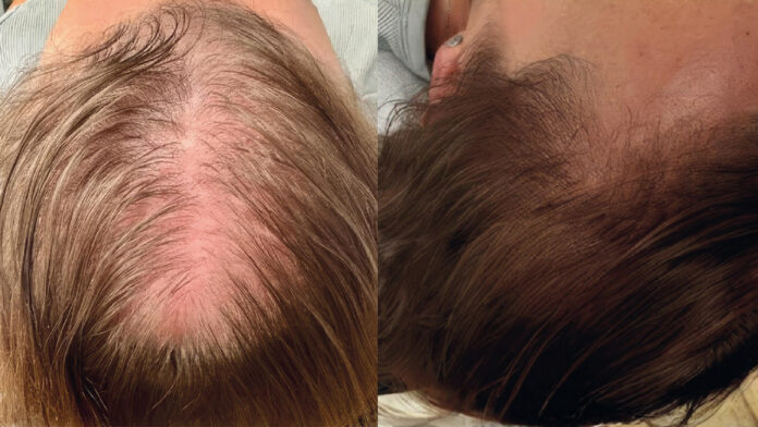 Wyniki: Po zakończeniu cyklu terapeutycznego stwierdzono zwiększenie gęstości włosów w okolicy przedziałka i zakoli, ograniczenie przetłuszczania skóry głowy oraz poprawę struktury włosów. Kobieta nie zgłaszała działań niepożądanych.
